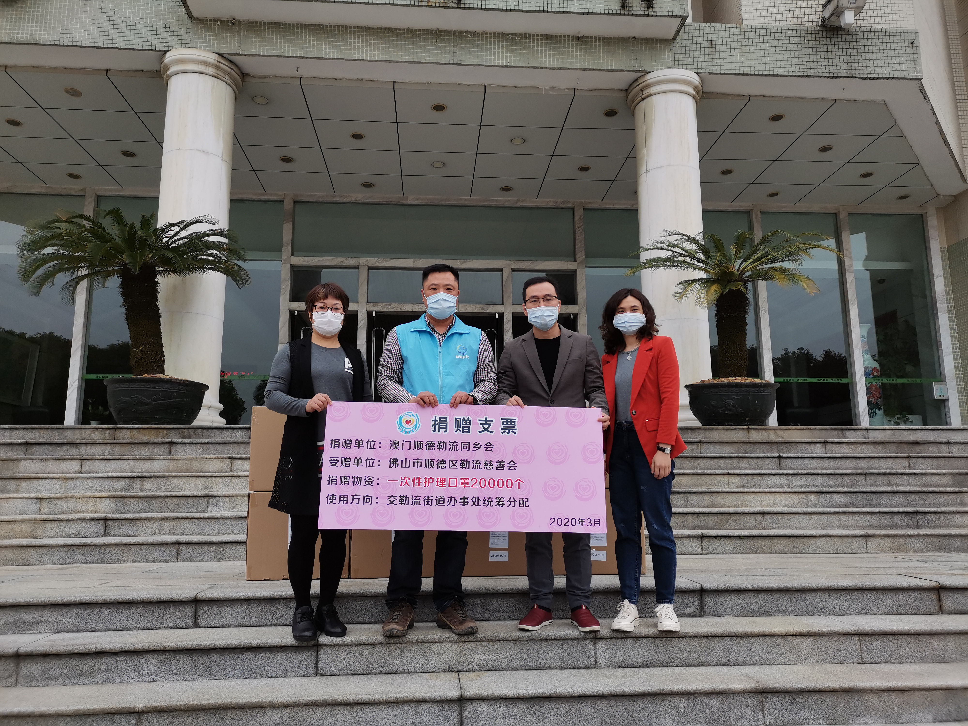 3月12日上午,澳门顺德勒流同乡会向勒流街道捐赠口罩20,000个(价值60,000元),勒流街道党工委副书记陈俊贤代表接受捐赠。