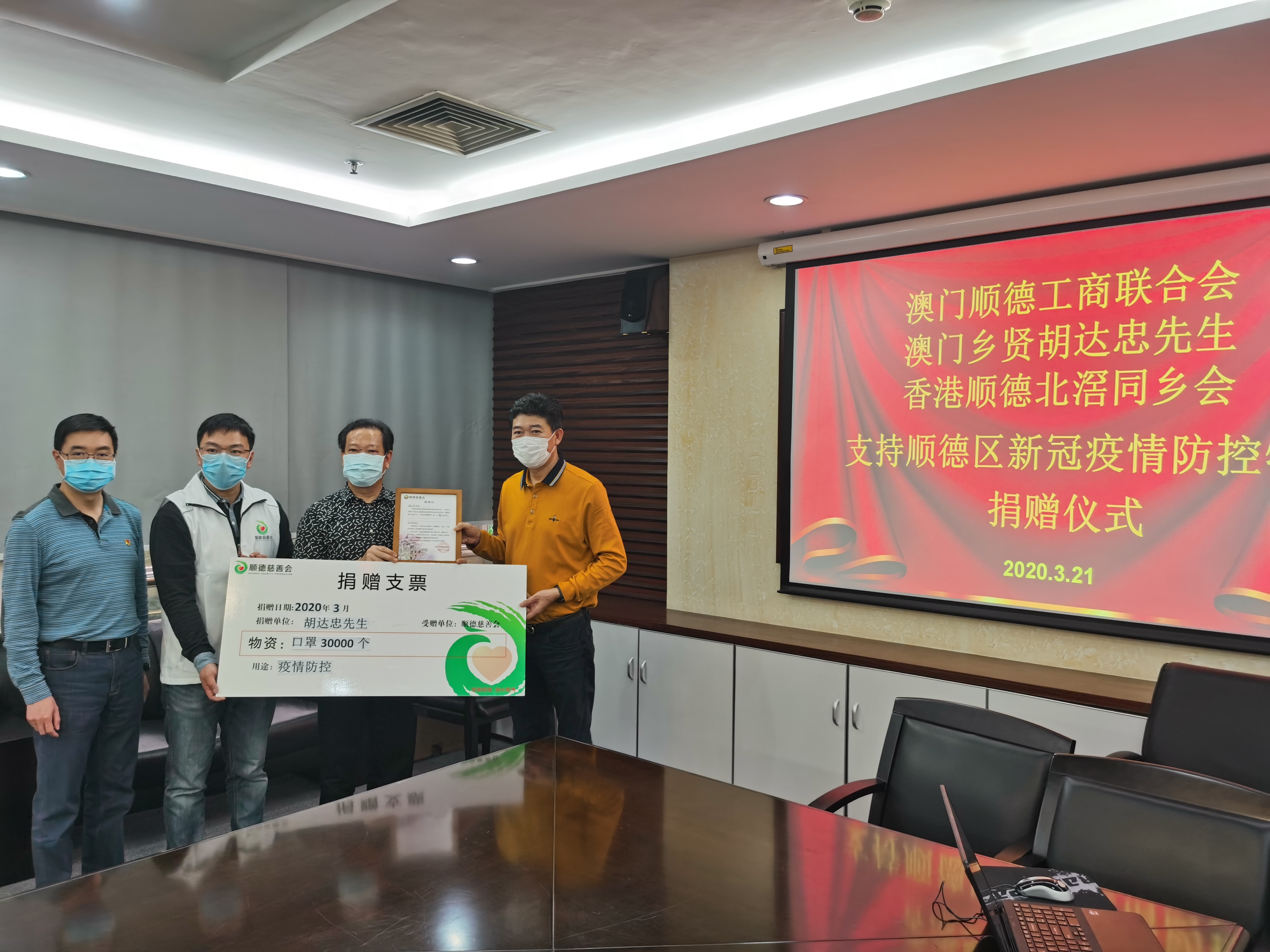 3月21日下午,顺德区新冠疫情防控物资捐赠仪式在区委统战部会议室举办,廖成志代表澳门顺德勒流同乡会会长胡达忠先生参加此次会议。