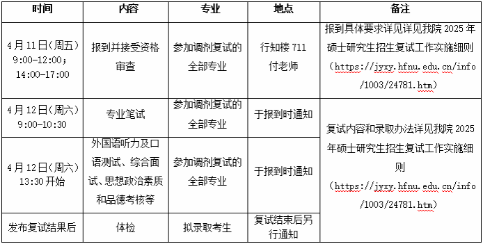 其他未尽事宜请见《合肥师范学院2025年硕士研究生招生复试录取工作方案》http://yjsc.hfnu.edu.cn/info/1181/19461.htm