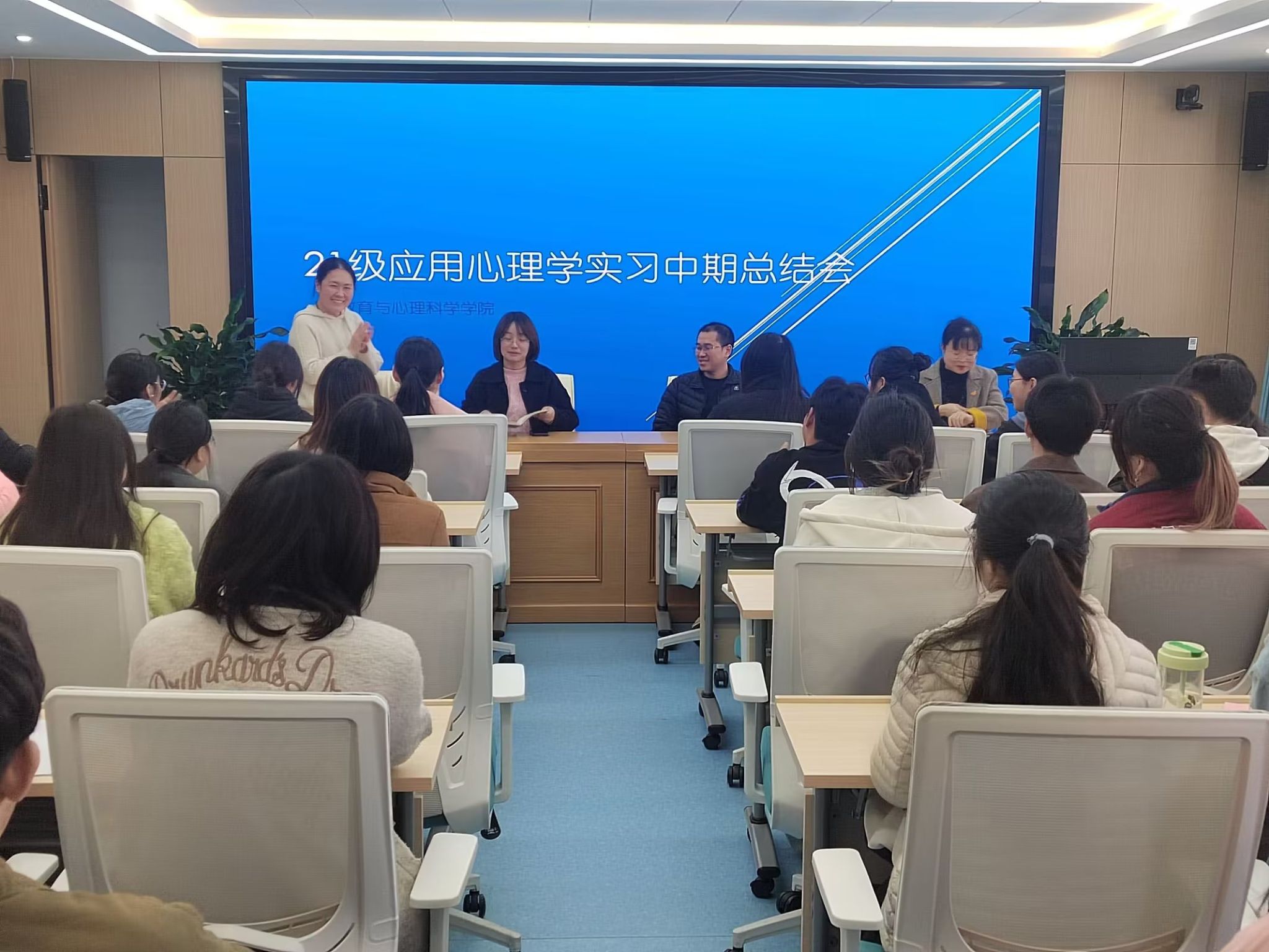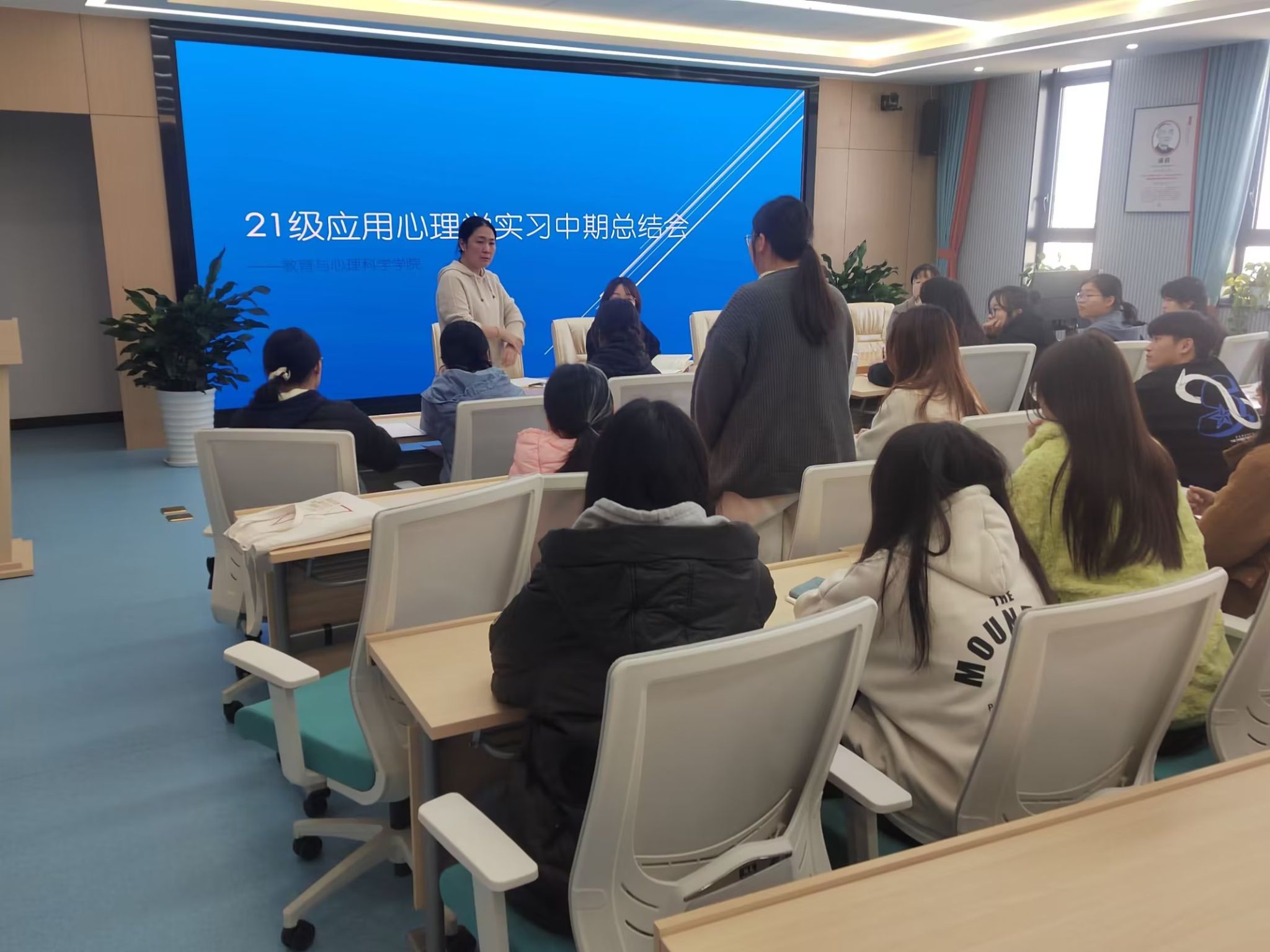 本网讯 为深入了解师范生教育实习情况,强化师范生教育实习工作,11月27日,教育与心理科学学院在图书馆7楼召开21级应用心理学专业实习中期总结大会,教育与心理科学学院副院长胡哲、心理系主任黄凤、实习负责老师梁昕和实习带队老师吴姗姗出席会议,会议由梁昕老师主持。
