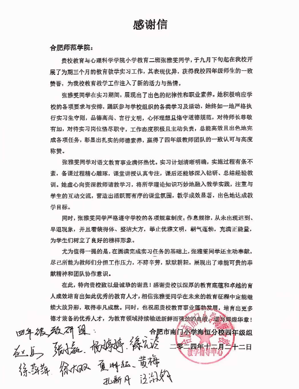 实习单位在感谢信中对张雅雯同学的表现给予高度评价,称赞其为学校教育教学工作注入了新活力,同时也对合肥师范学院的人才培养质量表示肯定,希望未来能培育出更多德才兼备的优秀人才,为教育领域持续输送新鲜而强劲的血液。此次实习成果彰显了我院学生在实践教学方面的显著成效,也为其他同学树立了榜样。(教育与心理科学学院:唐银 张雅雯)