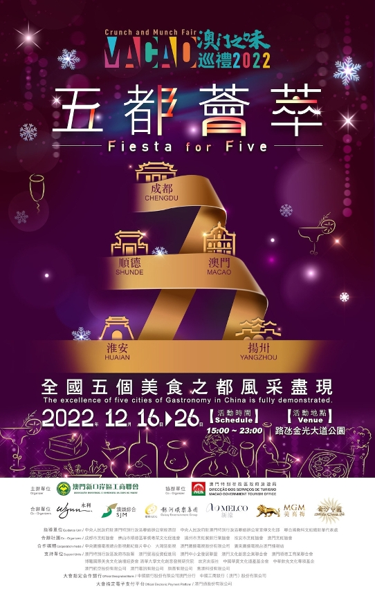 承接去年纪录片《澳门之味》的成功,澳门新口岸区工商联会主办、旅游局协办及澳门六大综合旅游休闲企业合办的“澳门之味巡礼——五都荟萃"定于12月16至26日一连11天精彩展现成都、顺德、扬州、淮安及澳门五都的美食魅力与文化风采。