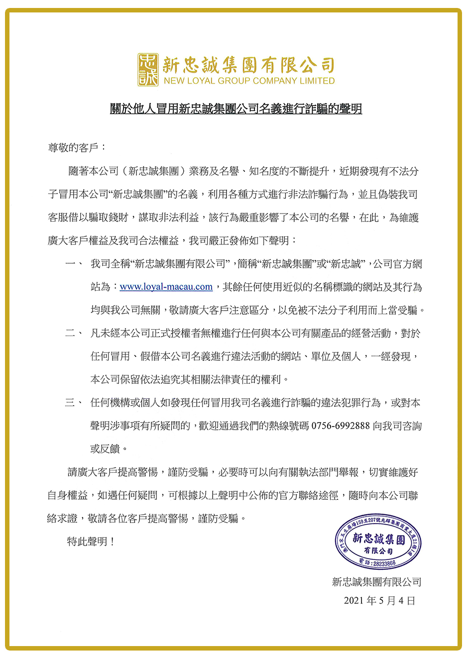 一、 我司全称“太阳成集团tyc122cc入口集团有限公司”,简称“太阳成集团tyc122cc入口集团”或“太阳成集团tyc122cc入口”,公司官方网站为:www.loyal-macau.com,其馀任何使用近似的名称标识的网站及其行为均与我公司无关,敬请广大客户注意区分,以免被不法分子利用而上当受骗。